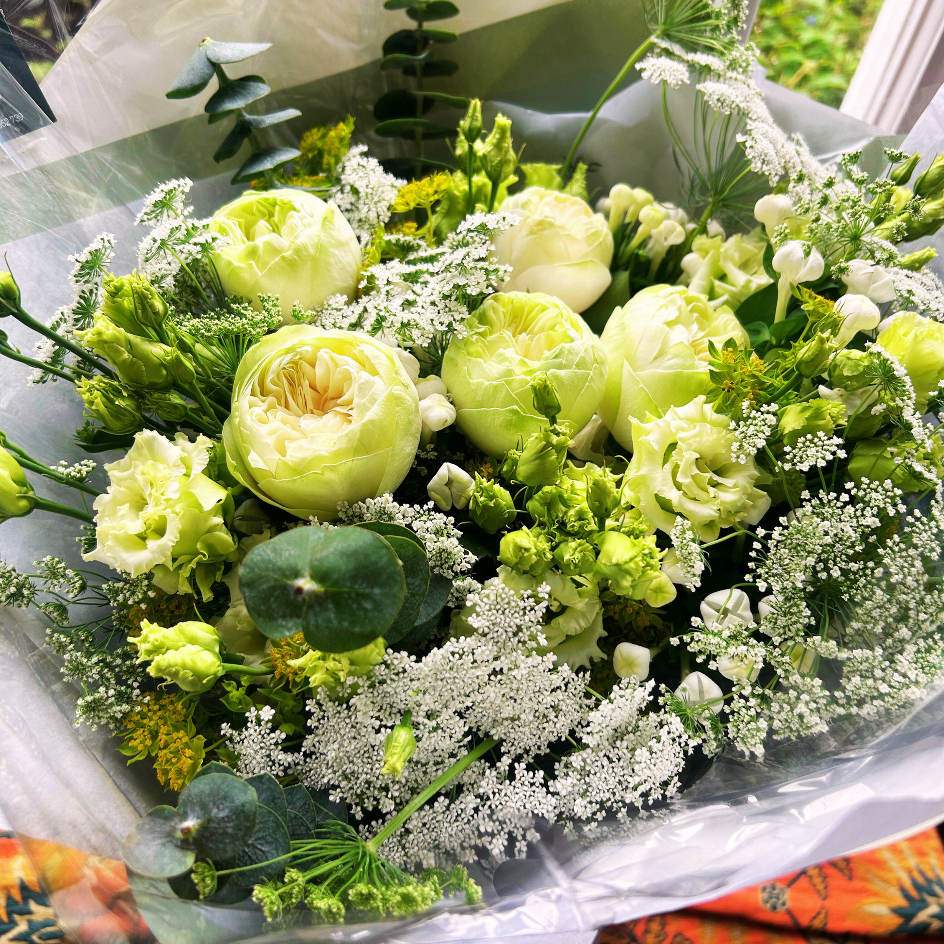 Step into a serene English meadow with Anwen, a delicately hand-tied bouquet brimming with timeless romance and soft countryside charm. Creamy roses unfold like vintage lace, while frilly lisianthus, Queen Anne’s lace, and golden Bupleurum flowers dance between fresh eucalyptus and lush seasonal greens.