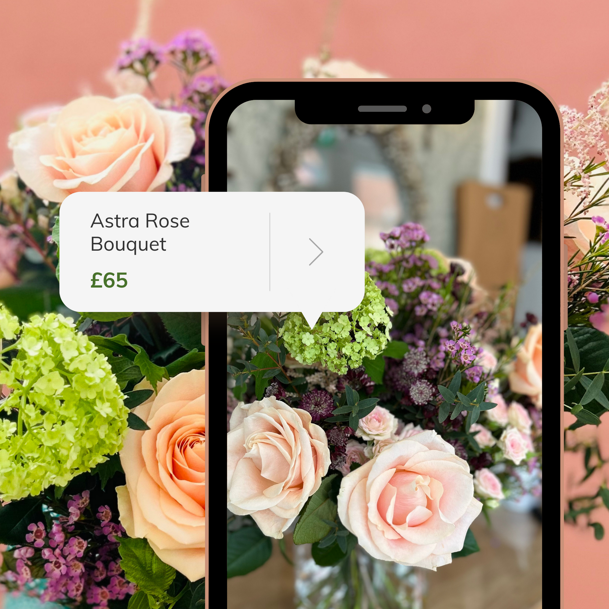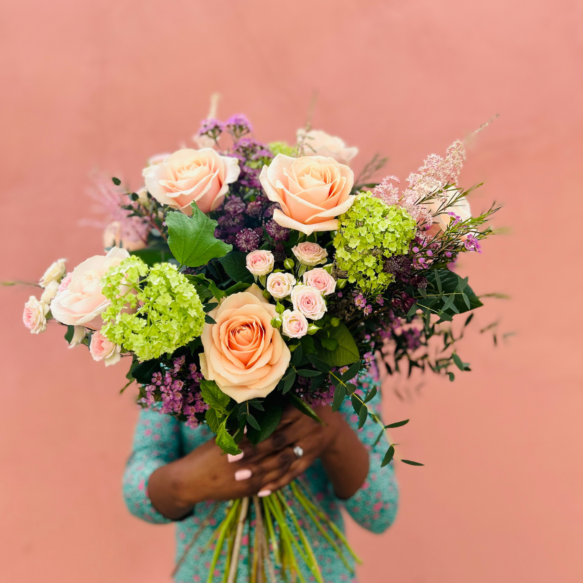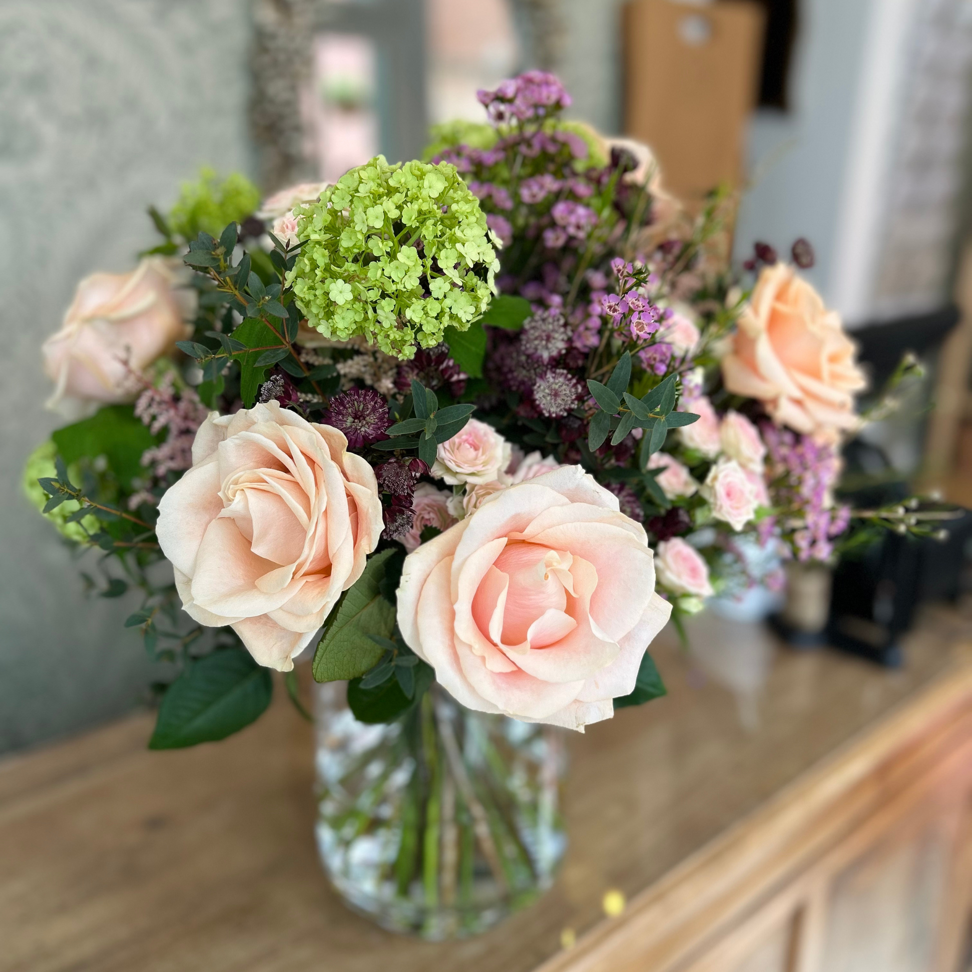Astra Rose, a medley of exquisitely arranged Astrantia flowers-- luminous symbols of Star. a strong brave protector-- delicately coalesced with graceful Rose wax blossoms, Astilbe, and seasonal foliage to create an opulent and luxurious bouquet.