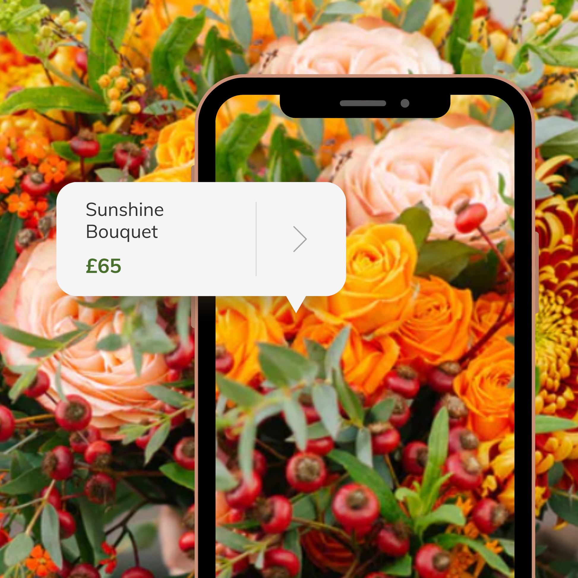 Indulge your senses amidst a masterful arrangement of roses, chrysanthemums, crocosmia, rosehip, strawflowers, and seasonal foliage, enveloping you in a vivid display of nature's passionate charm.