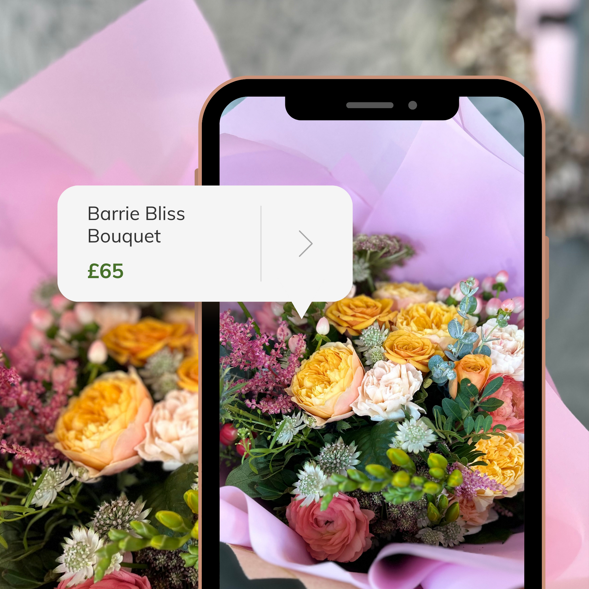Artfully arranged with the utmost care and attention, Barrie Bliss is available in sizes ranging from Medium to deluxe, with the medium arrangement pictured. We strive to provide the highest quality seasonal varieties, and may occasionally substitute stems accordingly.
