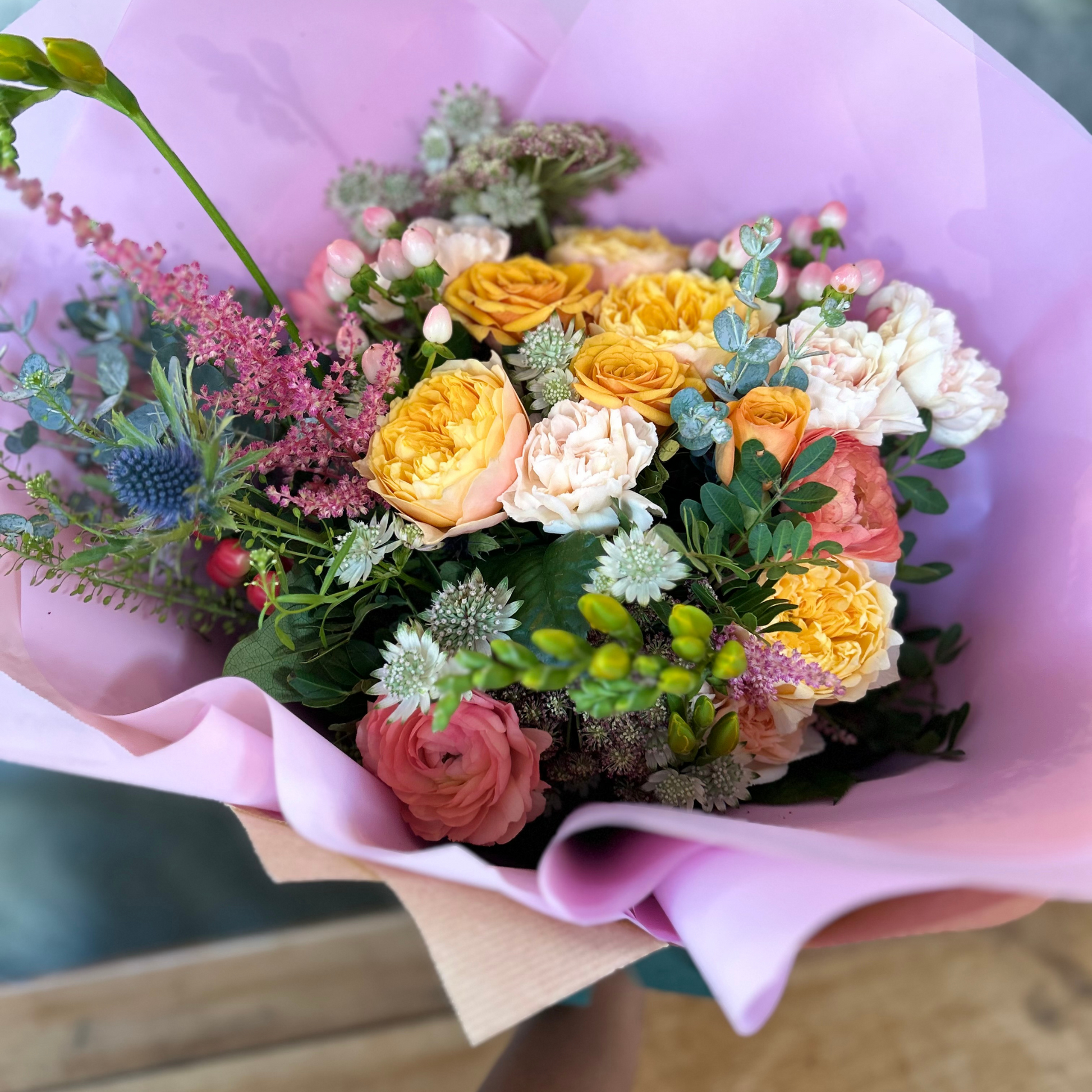 An enchanting harmony of Golden Vuvuzela roses, Astrantia, Hypericum Berries, Ranunculus, Carnations, and Astilbe, artfully embracing a bouquet of seasonal foliage.