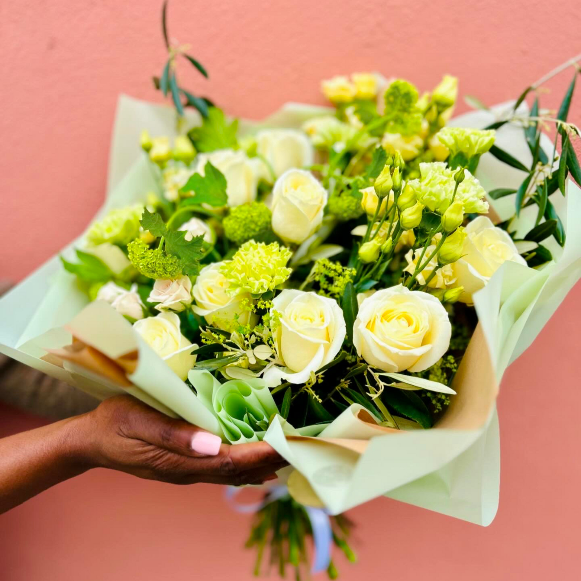 Indulge in the beguiling beauty of a Lemon and lime Bouquet, exquisitely crafted by our deft florists. Revel in the glorious yellow hues of VIP Royal Park Roses, the verdant accents of Green Carnation Roses, the delicate lisianthus, Guelder Rose, ammi majus, olive tree, beech, and the divine White Bubble Spray Roses, artfully arranged to produce a magnificent bouquet. Perfect for celebrating special events.