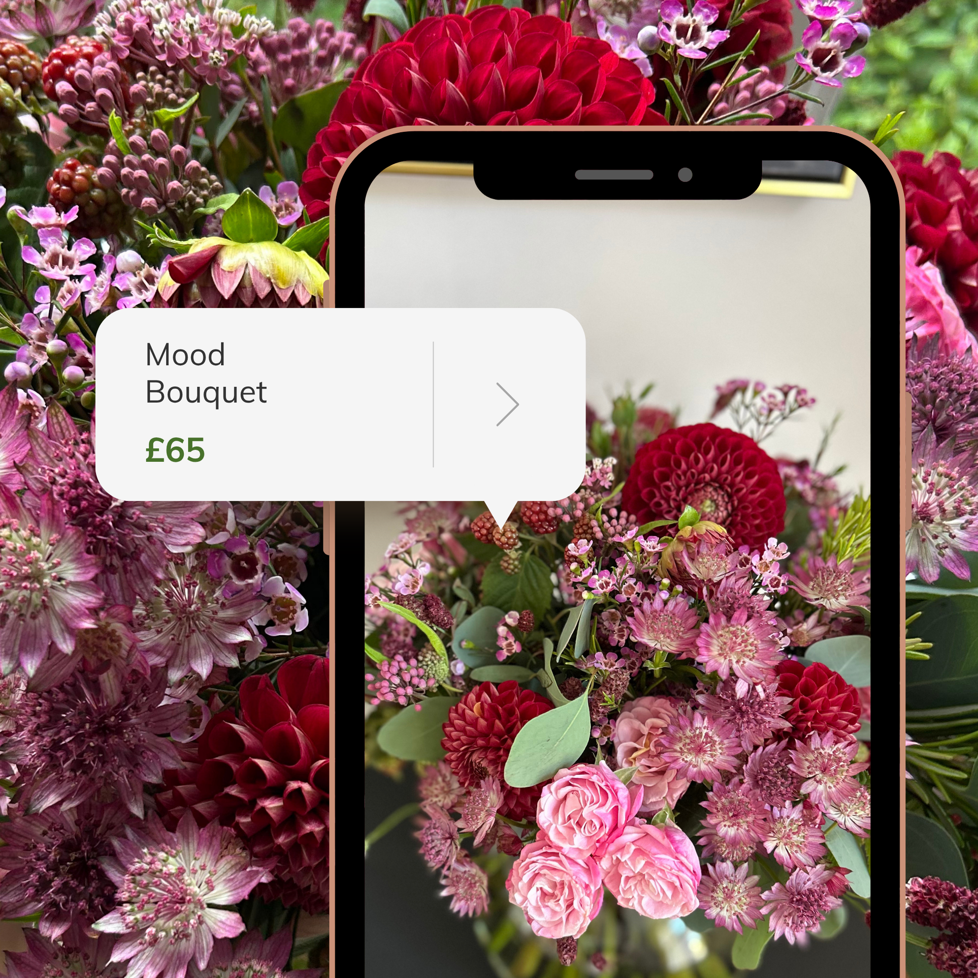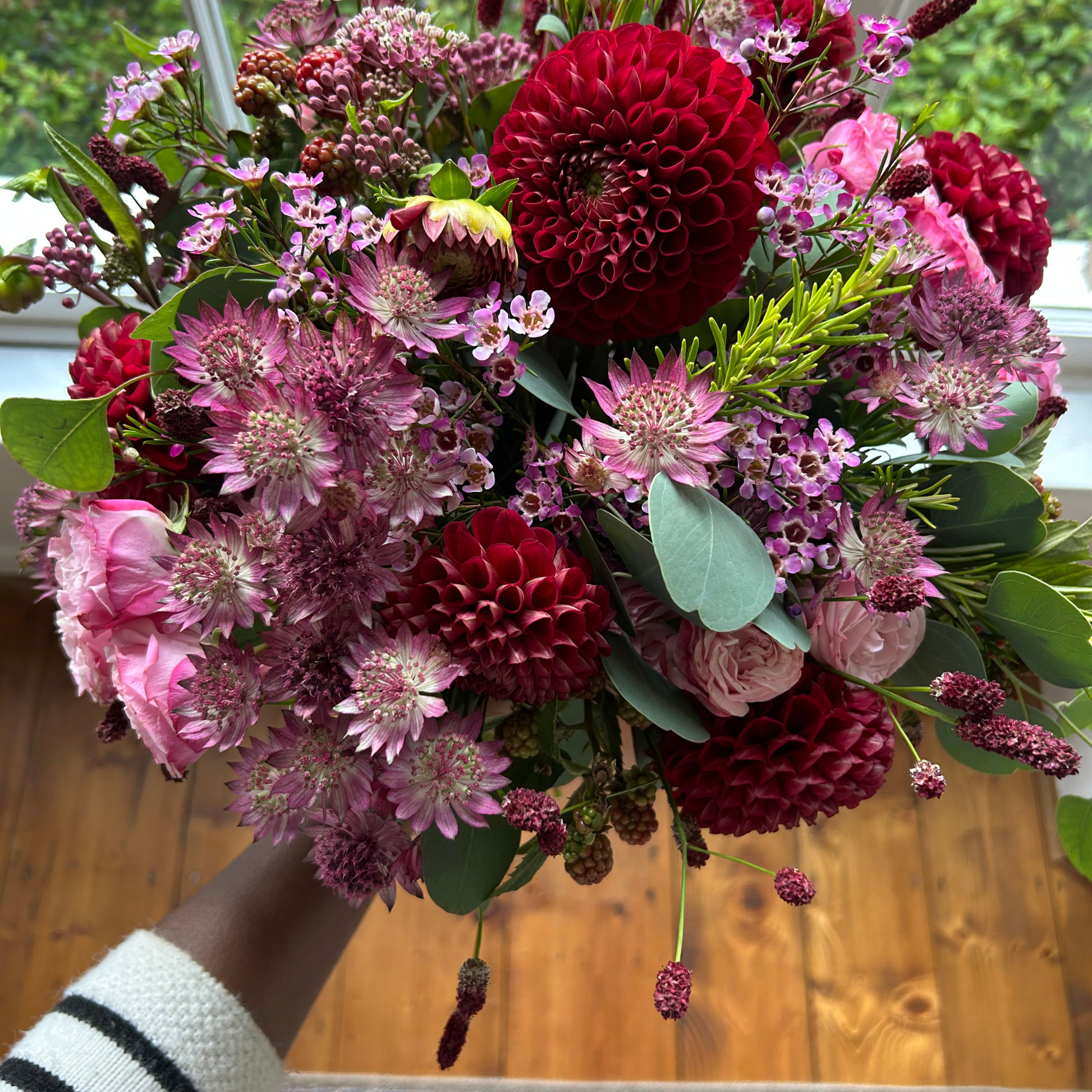 Behold a radiant congruence of delicate roses, astrantia, wax flowers, ripened berries, sanguisorba, and achillea, artfully embracing seasonal foliage to create an alluring and captivating aural symphony.
