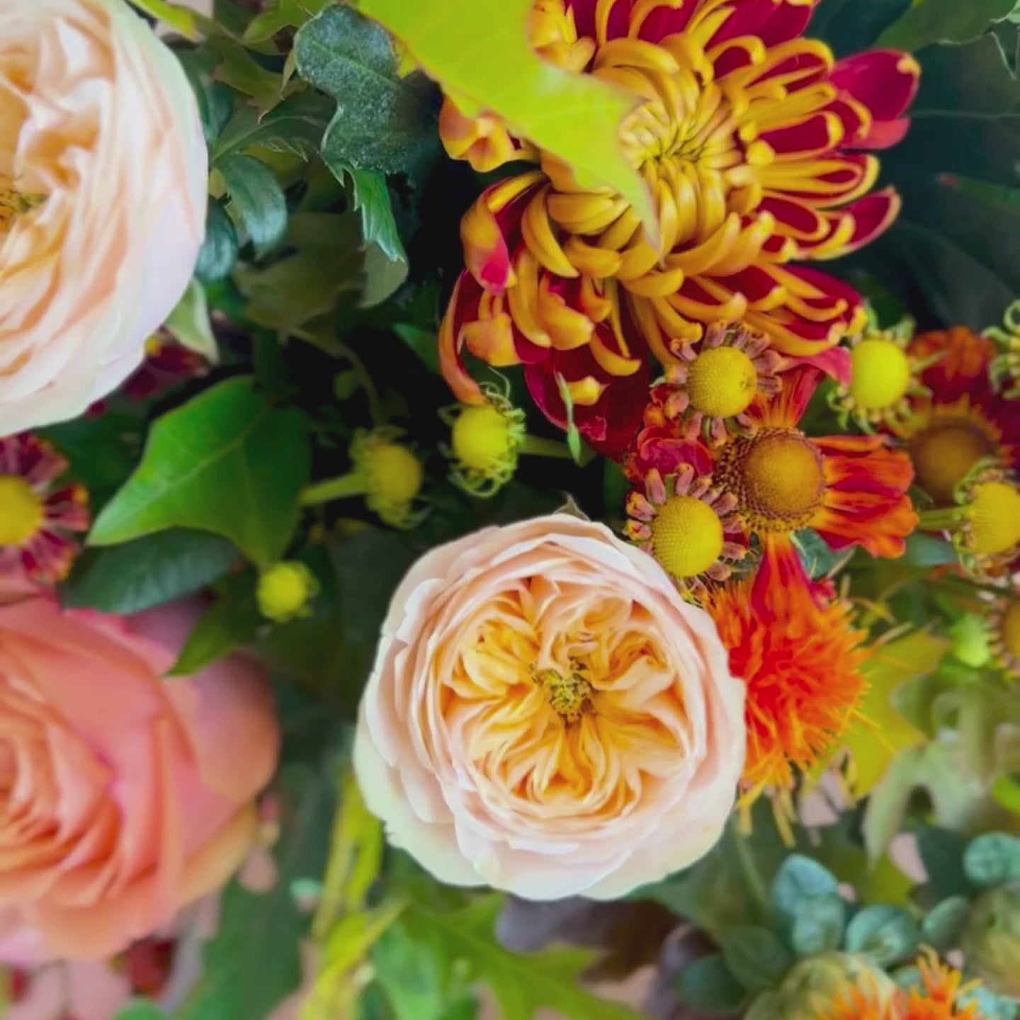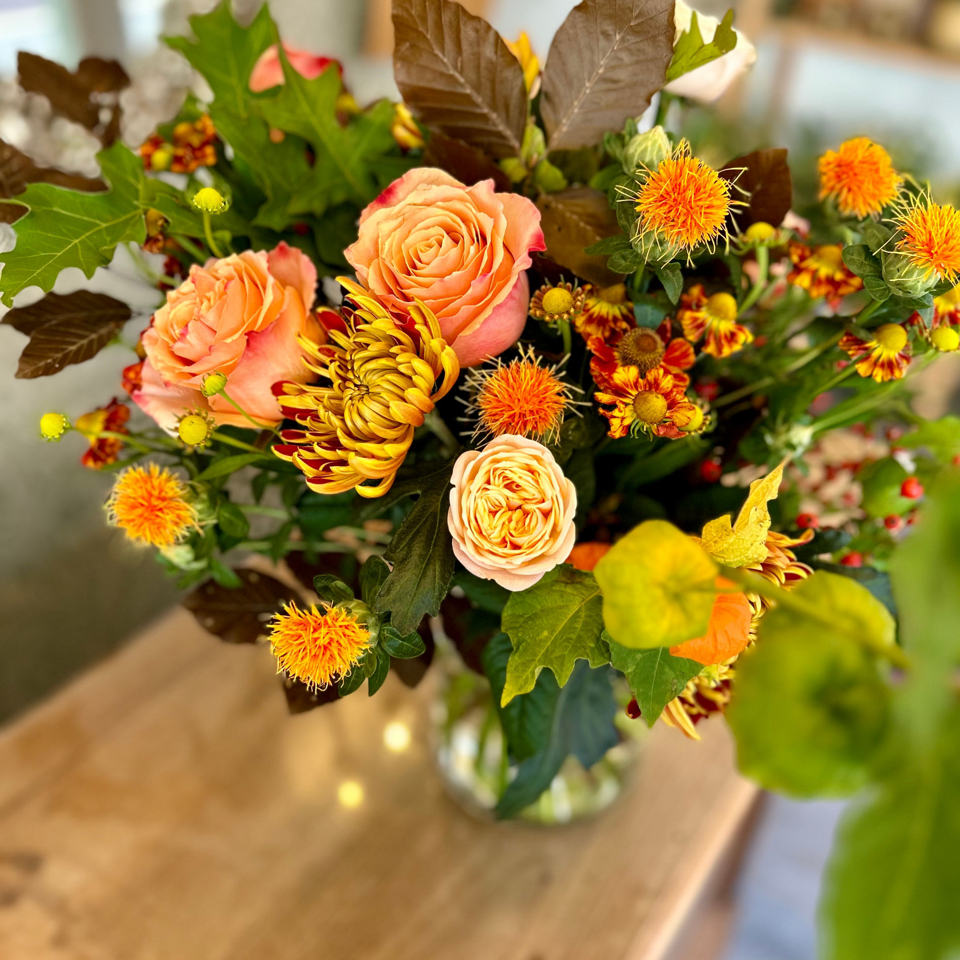Chrysants Fuego symbolizes loyalty and devoted love, offering a fiery burst of orange that mirrors the glow of autumn leaves. Helenium, often called "sneezeweed," is a symbol of joy and warmth, adding a sunny golden touch to the arrangement. The delicate lantern-like pods of Physalis represent abundance and prosperity, while the Garden Rose Carpe Diem reflects a sense of seizing the day and celebrating life’s fleeting moments.