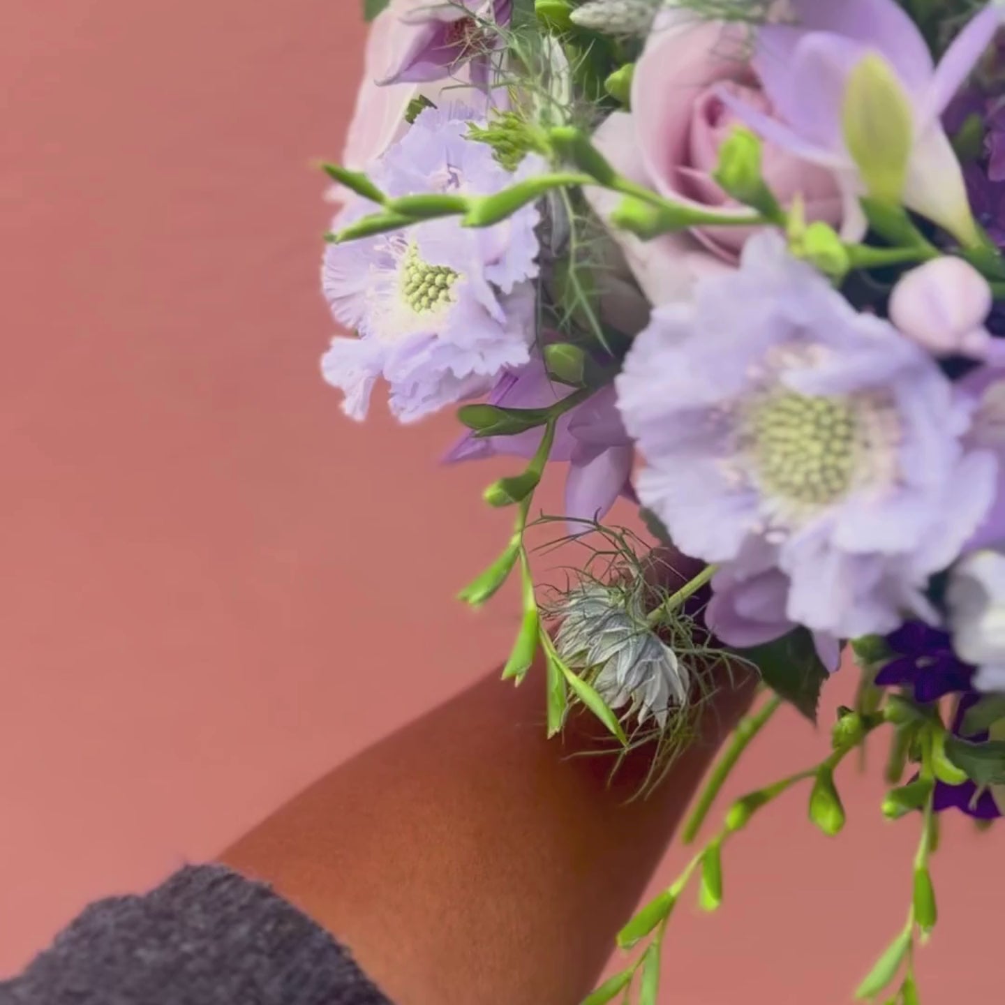 The "Lavender Dreams" bouquet features a stunning blend of deep purple, soft blues, and lilac hues, artfully arranged to create a soothing and elegant composition. It includes: