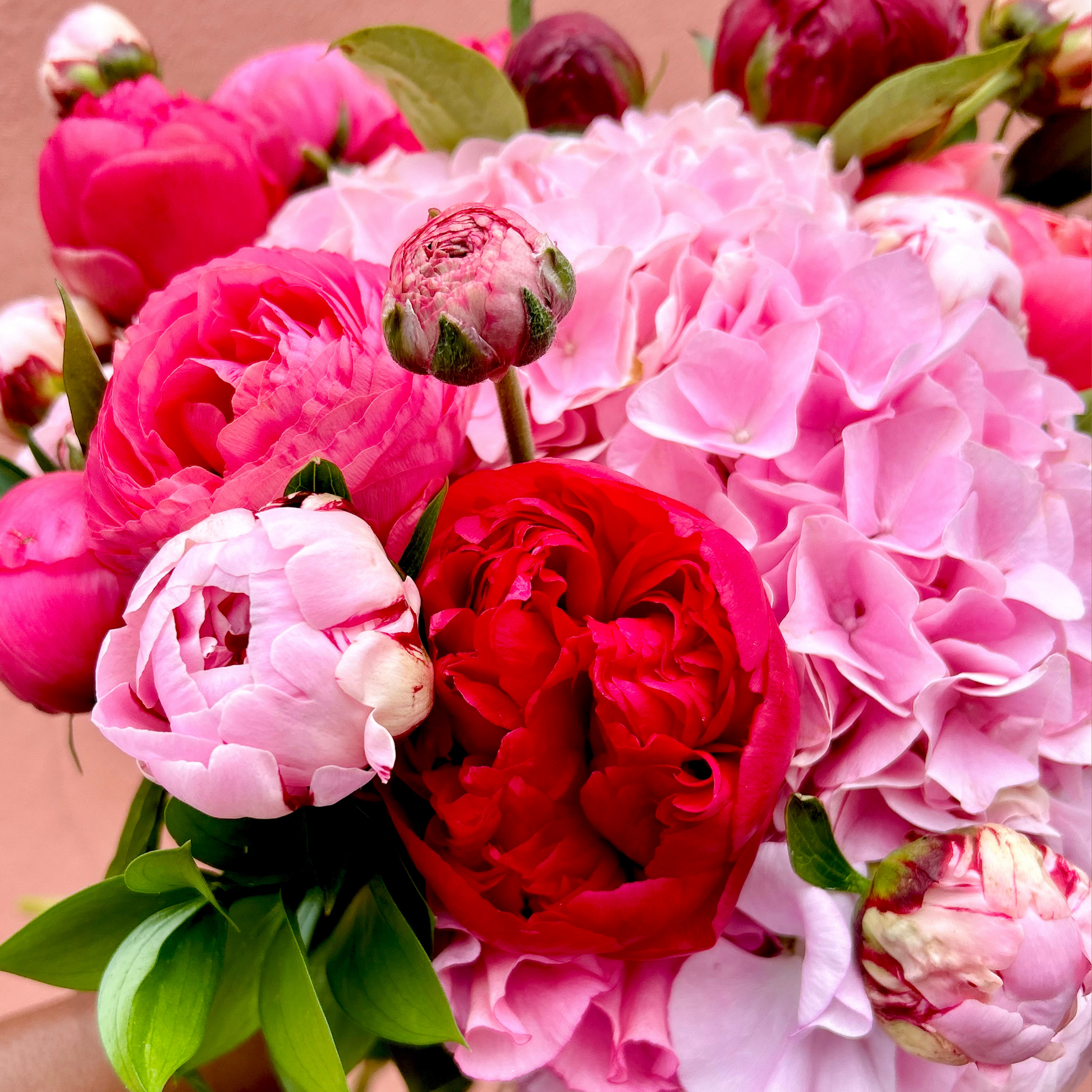 This arrangement captures the rich tones of burgundy and pink peonies, complemented by the softness of hydrangeas, the delicate charm of ranunculus, and the sweet fragrance of sweet peas.